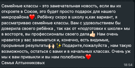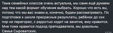 В семейные классы принимаются дети, чьи родители перешли (или собираются перейти) на семейную форму обучения.